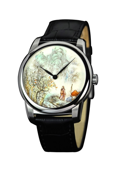 廊桥-对话系列 LONGIO·DIALOGUE系列,镜像反绘技术被率先用于表盘制造工艺。表盘主体是蓝宝石玻璃。自蓝宝石玻璃反向微绘,绘日月星辰、绘花鸟虫鱼、绘人间百态,融国画于纤毫之间凝练百年之技艺,对话诗意春秋。配以ETA2824自动机芯,任时光荏,此“芯”不改。 以DIALOGUE命名,意在透过腕表的缩微景致,建立起佩戴者与时间、与诗歌、与自我的“对话”。佩戴腕间,于远漠的情绪里,忘情冥想,将自己沉醉在时空里那场灵犀相通的对话里。 展位号:HALL 2.0/A73 |