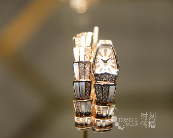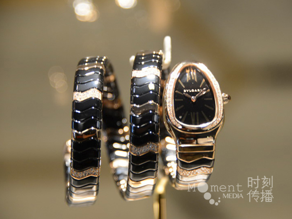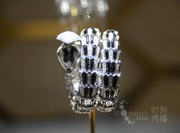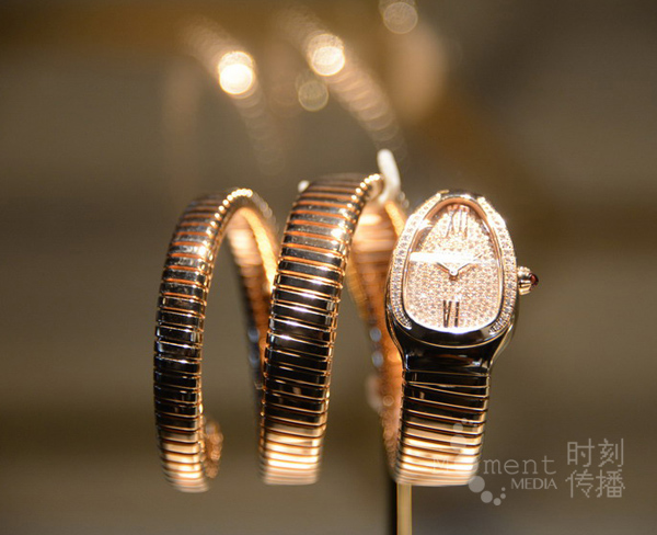 来自意大利的品牌宝格丽(Bvlgari),是继法国卡地亚和美国蒂芙尼之后的世界第三大珠宝品牌。居于1号馆1.0/A01的绝佳位置,让我们一进门就被其绚丽的展厅牢牢地抓住了眼球。 宝格丽展台外观以经典标志性的Serpenti及Tubogas系列为设计灵感,极具象征性的螺旋金束条状装饰环绕整个展厅,宛若82米长的巨蛇缠绕于建筑之上。 作为宝格丽(BVLGARI)极致魅力的象征,Serpenti 系列蕴涵着迷人的永恒风华,体现着宝格丽(BVLGARI)和女性之间的不解情缘。Serpenti 系列因伊丽莎白-泰勒的偏爱而成为不朽的经典,而蛇图腾的力量也为其赋予了永恒的魅力。 宝格丽重点展示了Serpenti与展位外形的相呼应。