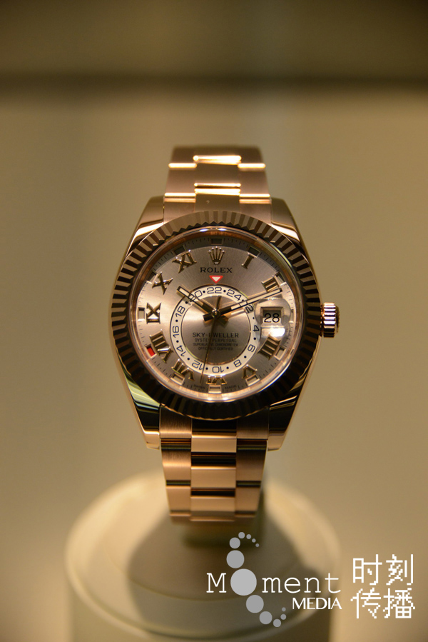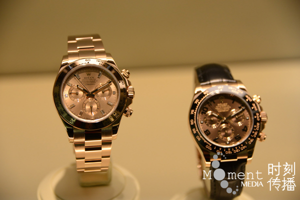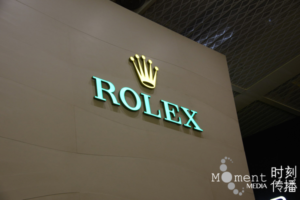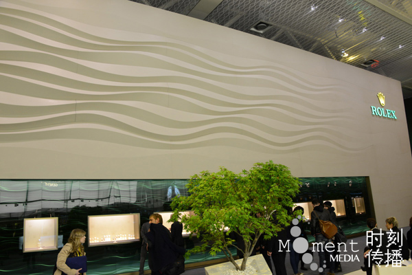 淡米、绿色两种色调的墙壁及内部细节装饰及巨大的皇冠型品牌标志衬托劳力士出豪华大气的风范,而整体展位巨大的波浪水纹图案设计来自蚝式腕表的灵感之源——海洋,讲述着品牌的优势领域——防水性能以及与海洋世界近百年的渊源。