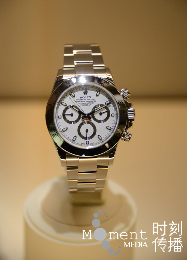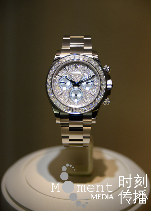 蚝式恒动宇宙计型迪通拿 宇宙计型迪通拿的40毫米蚝式表壳防水深达100米(330英尺),是坚固优雅、完美比例的典范。独具特色的中层表壳以贵金属之尊原块实心950铂金铸造而成。三角坑纹底盖由劳力士表匠以品牌专属的特殊工具旋紧,使表壳完全密封。上链表冠则采用劳力士专利的三扣锁三重防水系统,和计时按钮一样,牢固地旋紧于表壳,并且受到与中层表壳连为一体的表冠护肩的保护。此外,镜面则以抗刮损蓝水晶制造。宇宙计型迪通拿的防水蚝式表壳为高度精准的机芯提供最佳防护。