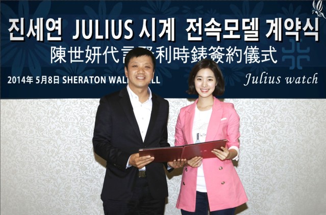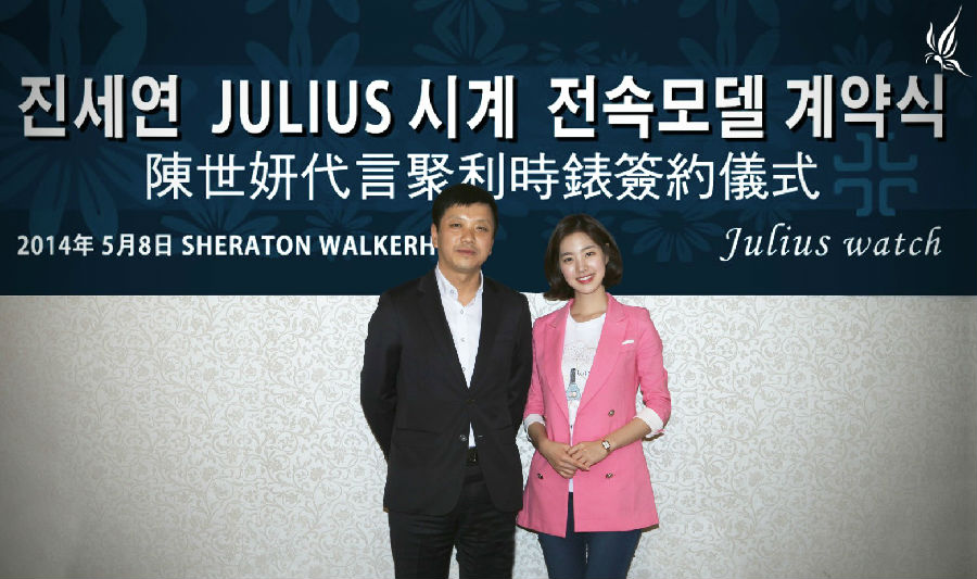 2014年5月8日,佳马钟表董事长朴龙男在韩国与陈世妍举行隆重的签约仪式,时尚靓丽的韩国新生代偶像陈世妍正式成为聚利时手表代言人。
