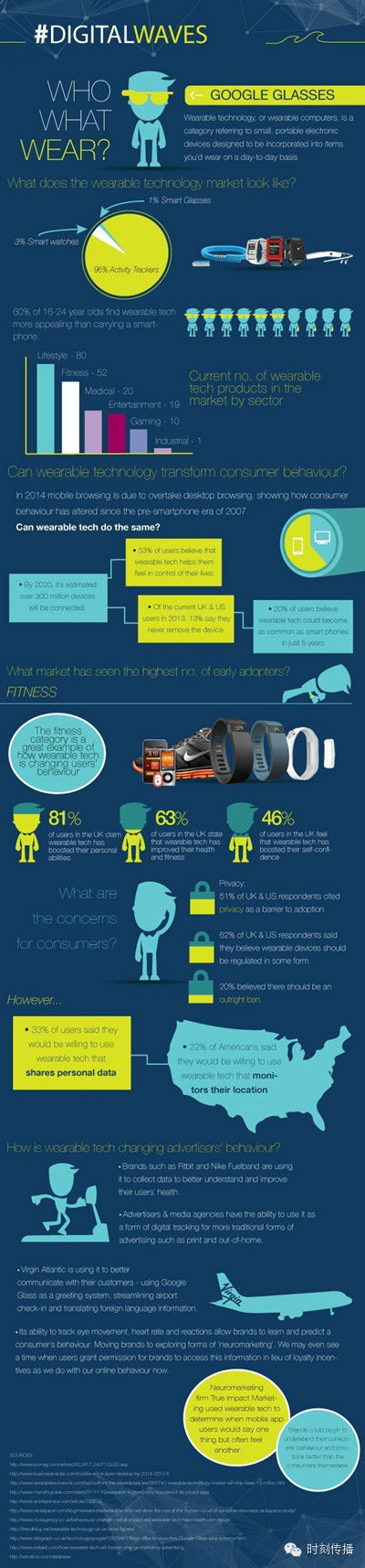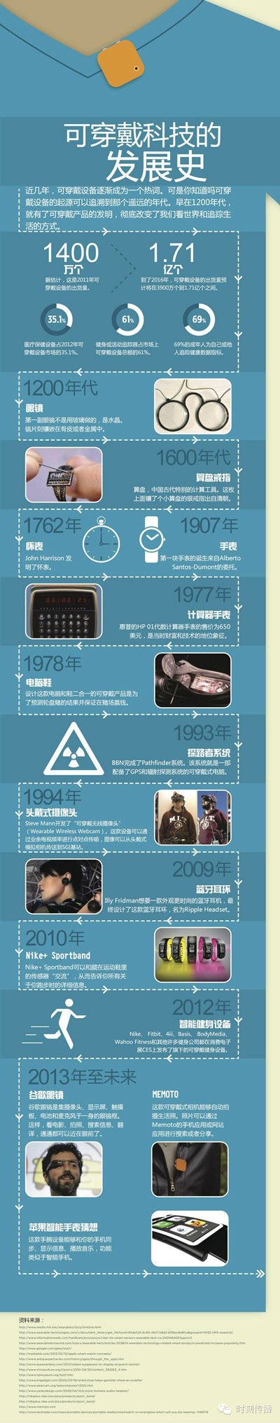 【导语】可穿戴设备即直接穿在身上,或是整合到用户的衣服或配件的一种便携式设备。可穿戴设备不仅仅是一种硬件设备,更是通过软件支持以及数据交互、云端交互来实现强大的功能,可穿戴设备将会对我们的生活、感知带来很大的转变。 可穿戴设备的发展历史 近几年,可穿戴设备逐渐成为一个热词。可是你知道吗可穿戴设备的起源可以追溯到那个遥远的年代。早在1200年代,就有了可穿戴产品的发明,彻底改变了我们看世界和追踪生活的方式。 可穿戴设备的人群分析 可穿戴设备是否被大多数人所接受?调查发现,有60%的16-24岁的年轻人们觉得可穿戴设备比智能手机更有趣味。 可穿戴设备的人体部位分析 从下图可以看出,可穿戴设备比较喜欢在服装跟手腕上做“文章”,在这两处的百分比和占到了整个身体的一半以上。 1、头部可穿戴设备 头部来讲可穿戴设备的设计主要集中在耳朵、眼睛等器官。 耳机 眼镜 头盔 2、颈部可穿戴设备 配饰 3、衣服可穿戴设备 4、手部可穿戴设备 手部可穿戴设备大多以腕表、戒指、手环等形式出现。 腕表 戒指 5、足部可穿戴设备 鞋子 周鸿祎:我觉得最大机会是什么?试想,就算每个人平均有1.5部手机,中国未来最多也就是 15 亿手机保有量,电脑可能就是 6 亿台,这些事情都确定。但是我告诉大家,如果未来你们想象你家里每个灯泡每个插座,你家里所有家电、你戴的眼镜、戴的手表,包括你能看到、想到的任何设备都是一个不叫手机的手机,内部可能都是基于安卓的一个智能系统,并且都利用 4G 或 WIFI 网络跟云端连接,那么五年之内中国应该会有两百亿台设备连到互联网上。这两百亿台设备每天都会产生巨量数据,所以我认为真正的大数据时代还没有来临。  |