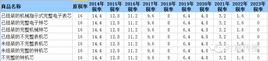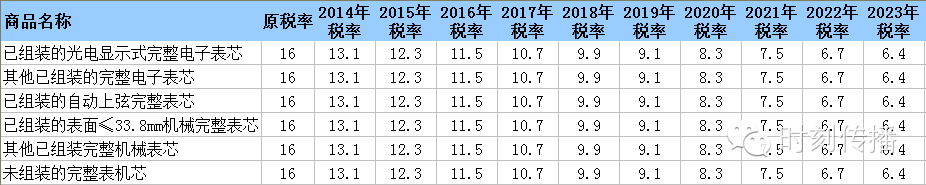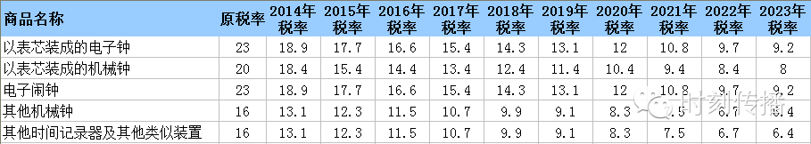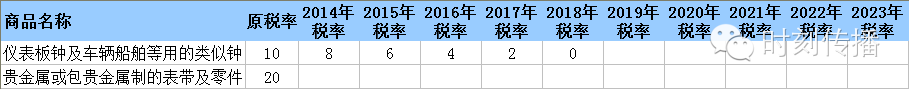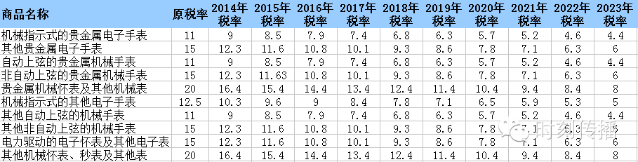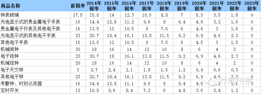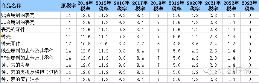 【导语】自中瑞自贸协定出台以来,焦点都集中在了瑞表降税的价格上。而中瑞自贸协定还有一个重要的组成部分就是,瑞方也对中方99.7%的出口实施零关税。近日,关于钟表产品中方降税模式已出炉,模式共分为五类。 1.A类一次性降至0关税; 2.B类为正常降税,5年等比例降税,5年后降为0,每年降税20%; B、D类税率 3.C1为一般敏感,10年等比例降税,10年后降为0,每年降税10%; C1类钟表及电子手表等税率 C1类钟机芯税率 C1表壳及零件等税率 4.C2为高度敏感,10年非线性降税,10年后降低60%税率,第一年降低18%,第2-9年每年降低5%,第10年降低2%; C2类手表等税率 C2类钟等税率 C2类表芯、机芯等税率 5.D类为例外产品,不降关税。 数据来源:中华人民共和国海关总署  |