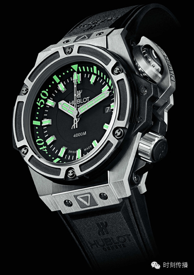 宇舶的王者至尊48毫米,虽然数据上不超过50毫米,但是4000米潜水表的排氦阀门非常夸张,俨然是一个潜水艇的舱门设计。与4000米不同的是,深海探秘1000米腕表配备计时码表机芯,四个巨大的表冠都配有旋钮式安全锁扣。其中10点钟位置上方表冠用于调整潜水时间,为了安全的理由,这枚表冠设定为单向旋转,并由一个特大的表冠护桥保护。