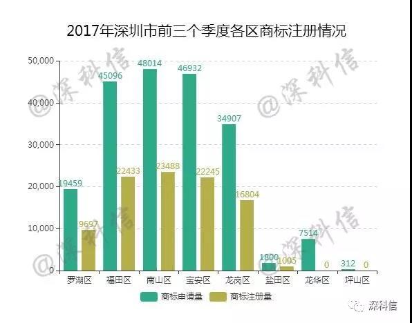 由上述数据可以看出,深圳市2017年的前三个季度,商标申请和注册数量比较高的分别为南山区、福田区和宝安区,而龙华区和坪山区商标注册量竟为0。