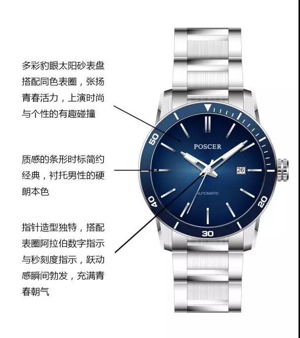 腕表整体青春时尚,以绚烂的表盘传达个性男生的时尚态度,深海蓝表盘搭配原钢色金属表带,精致有型,举手投足间传达佩戴者的不羁个性。