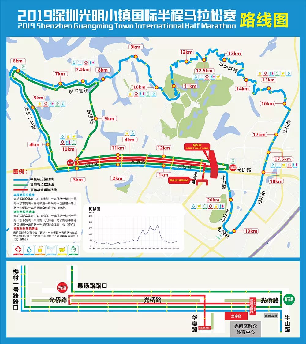 本次比赛由中国田径协会与光明区人民政府共同主办,共设置半程马拉松、微型马拉松以及嘉年华欢乐跑三个竞赛项目,起终点均设置在光明群众体育中心,脚步丈量之处,光明美景和城市发展风貌尽收眼底。