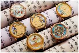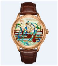 飞亚达敦煌主题珐琅腕表,搭载改装瑞士机械机心,以18K金表壳搭配尊贵鳄鱼皮表带,每款全球仅限量发售10枚,成为腕表爱好者争先收藏的经典。