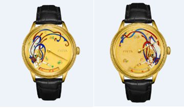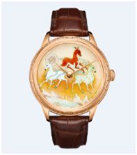飞亚达大师系列敦煌主题珐琅腕表,从敦煌壁画中撷取灵感,再现飞天、胡旋舞、莲花藻井与九色鹿等经典场景。腕表制作工艺复杂精致,首先由工艺大师手绘出图案,用直径仅为0.04毫米的24K金丝,在纯银底板的方寸之间,细细掐出飞天、胡旋舞、九色鹿等敦煌壁画的复杂轮廓;再在42毫米的表盘上,填充数十种不同颜色的珐琅釉彩;最后经过层层上釉,几十次的煅烧冷却,在800-900摄氏度的高温中,周而复始,让色彩不断浓烈,直至焕发出夺目的光彩。