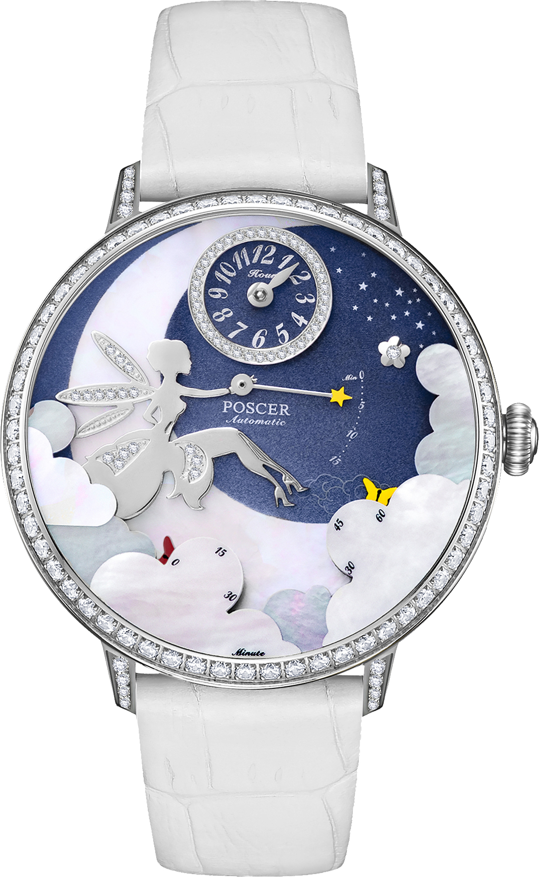 该款腕表采用仙子的形象,将人们内心对于美好事物的期许表达在方寸间。表盘中,一轮新月悬挂夜空,仙子在云海中挥舞着手中的魔法棒,15分钟一飞返,盘面配以3D打印技术打造的渐变星空表面设计,生动真实,细节之处彰显品质,伴随着夜色仙子挥动双翼飞驰过新月,彩蝶、鲜花等美好生灵环绕她身边,唯美梦幻。