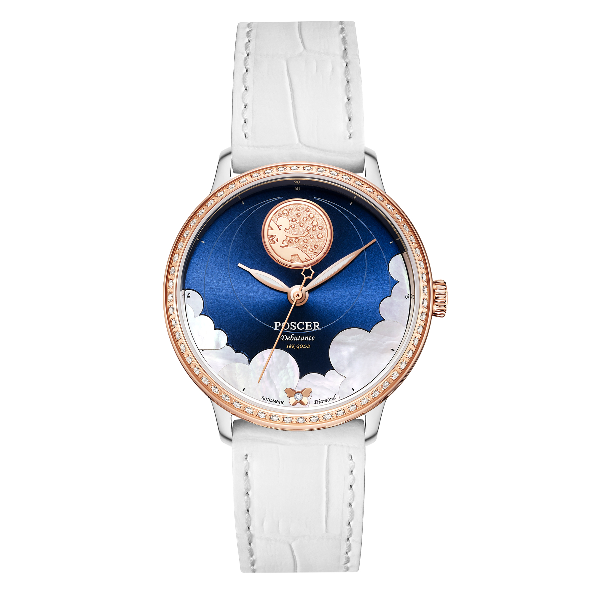 该款腕表表盘融入夜晚天空颜色,辅以云朵图案,唯美梦幻,给人以一种过目难忘的视觉享受。12位镶嵌18K玫瑰金币,精致闪耀;6点位蝴蝶形钻座上镶嵌真钻,具有自由飞翔的寓意,即使面对生活中的条条框框,也能活出自我。“浪漫与唯美,梦幻与自由”于魅力女星杨千嬅腕间尽显优雅风姿。