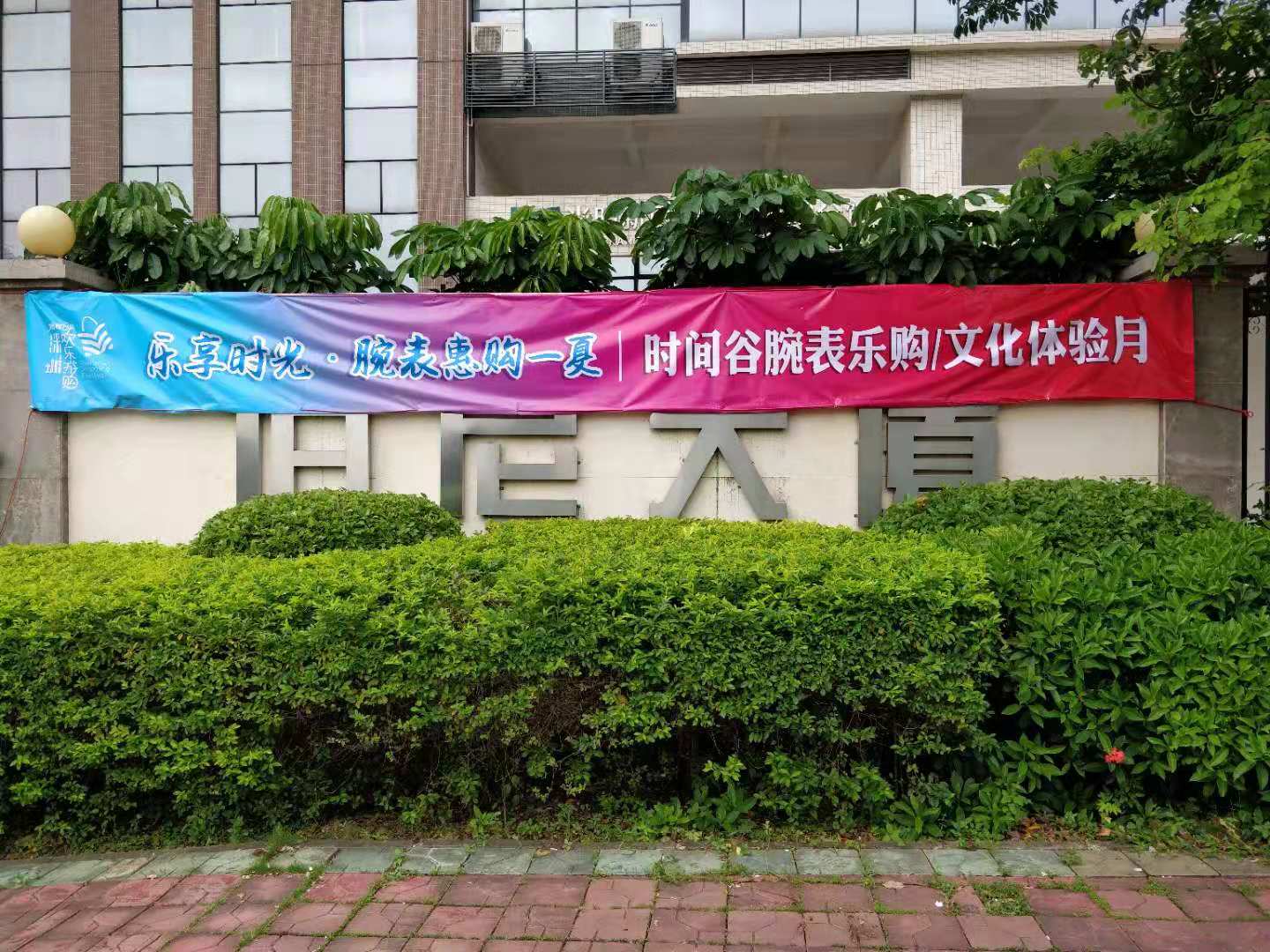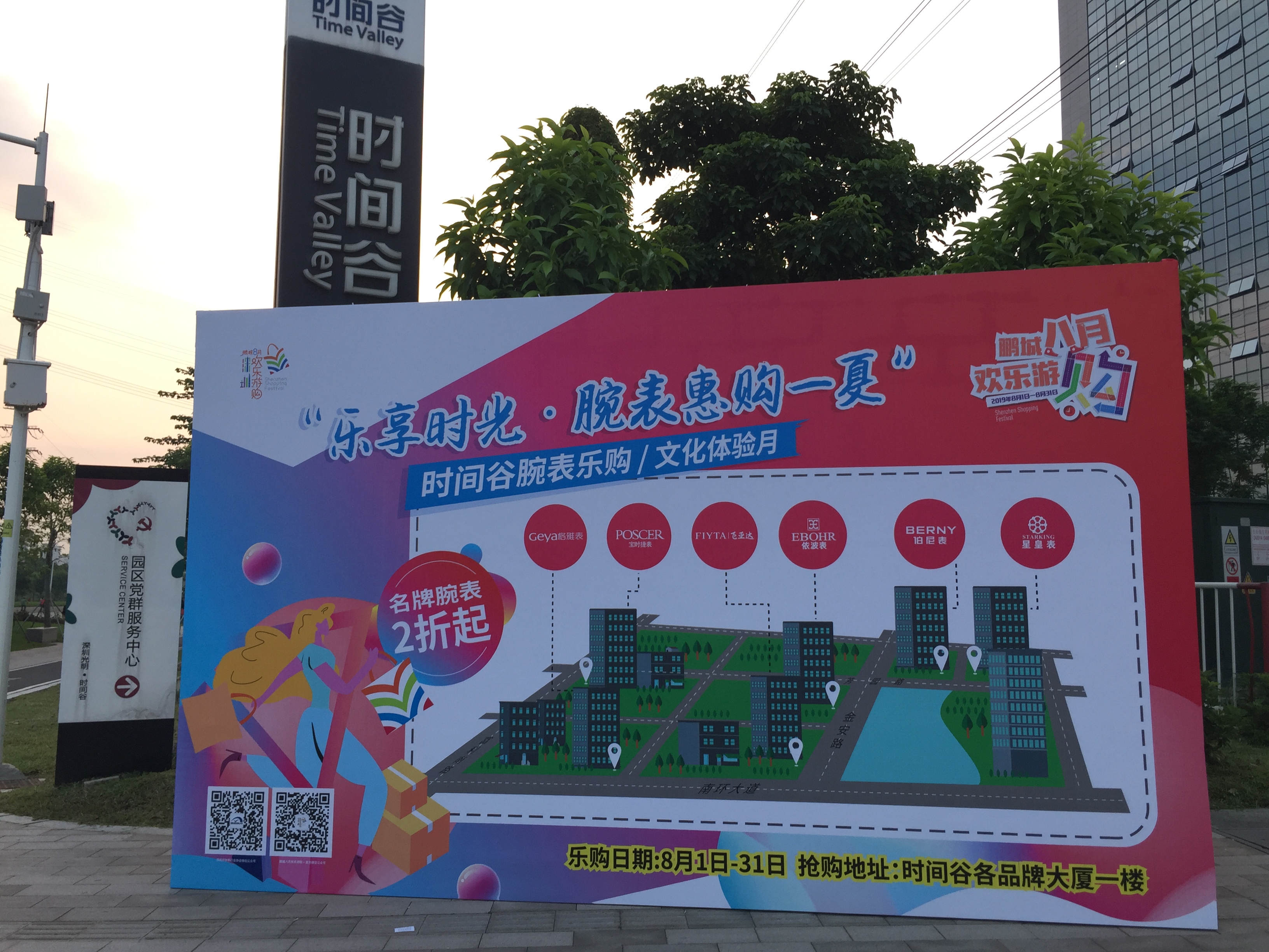 时间谷钟表基地周边的道路及居民区的购物节的宣传广告各品牌配合购物节整体活动,将在时间谷进行为期一个月的促销。