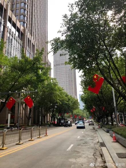 飘扬的五星红旗增添了一抹喜庆的氛围,广电的巨幅国旗更是引得市民注目。