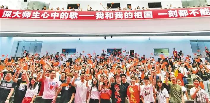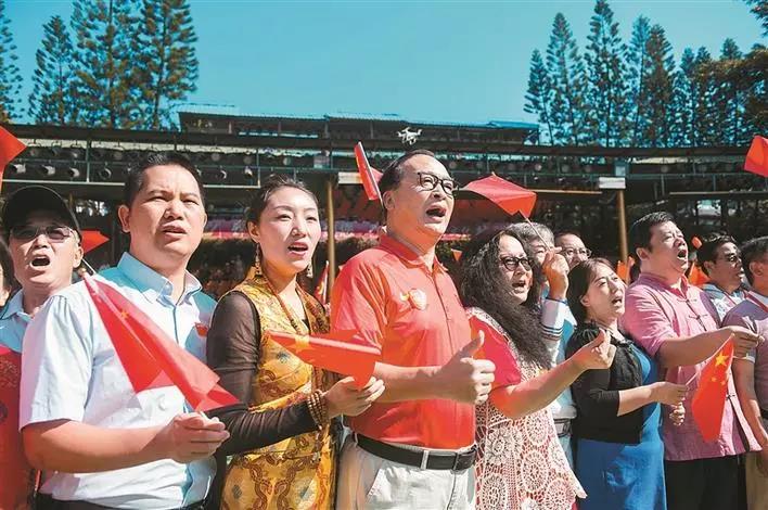 满城国旗飘扬,处处歌声嘹亮。近日,深圳各民族庆祝新中国成立70周年联欢活动在民俗文化村举行,现场观众手持五星红旗,齐声歌唱祖国。