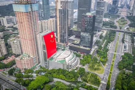 国庆前夕,深圳城市被装点一新,中心城区处处可见国旗迎风飘扬。全市500条城市道路灯杆上悬挂超过10万面国旗,重要区域和重点楼宇还悬挂着巨幅国旗和标语,引行人驻足。