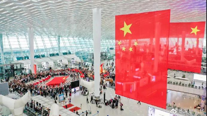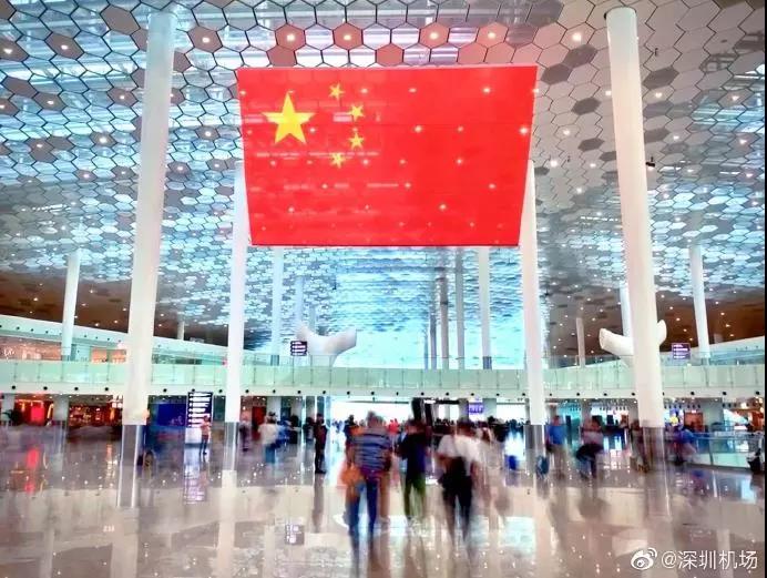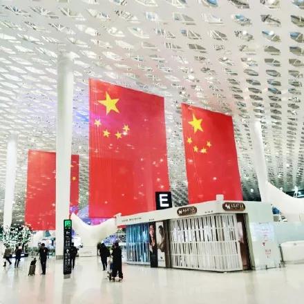 在深圳国际机场T3航站楼内,悬挂着四面巨型国旗,引得不少市民驻足拍照。