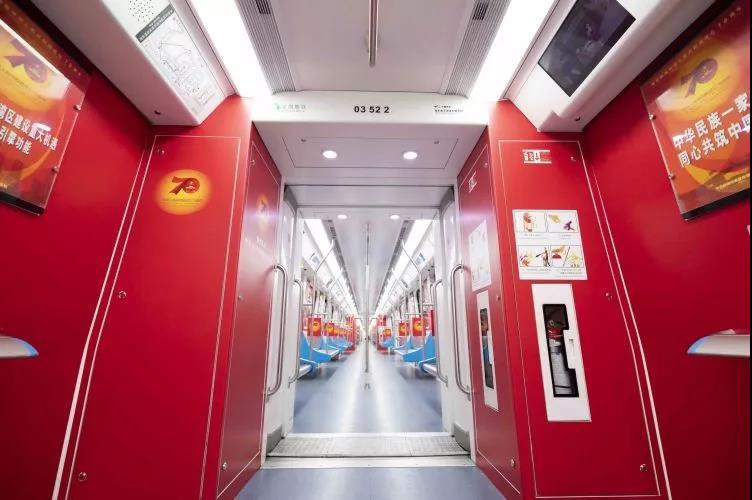 车厢内靓丽的中国红,让乘客们感受到浓浓的节日氛围。7列“庆祝中华人民共和国成立70周年”主题列车将持续运行一个月,满载深圳人民对祖国的热爱和祝福,成为深圳城市中一道美丽的风景线。
