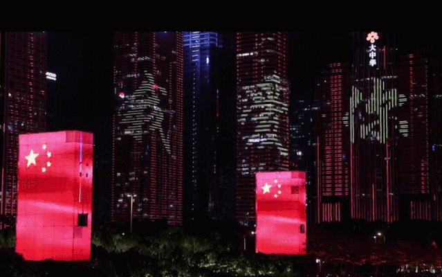 当晚7点半,灯光秀正式开始,四方楼宇瞬间亮起五星红旗图案。