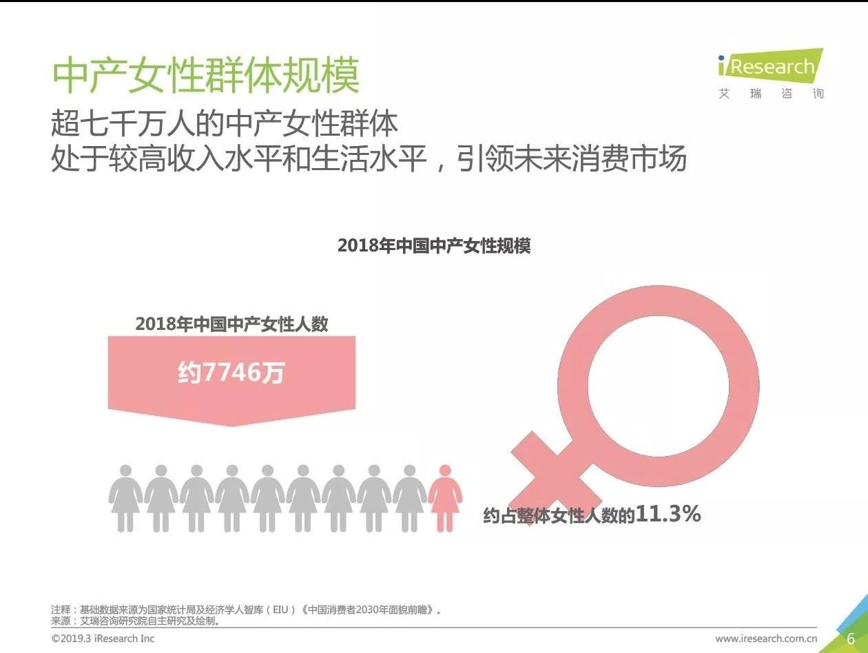 目前全国有约7746万中产女性群体,约占整体女性人数的11.3%,处于较高收入水平和生活水平,引领未来消费市场。