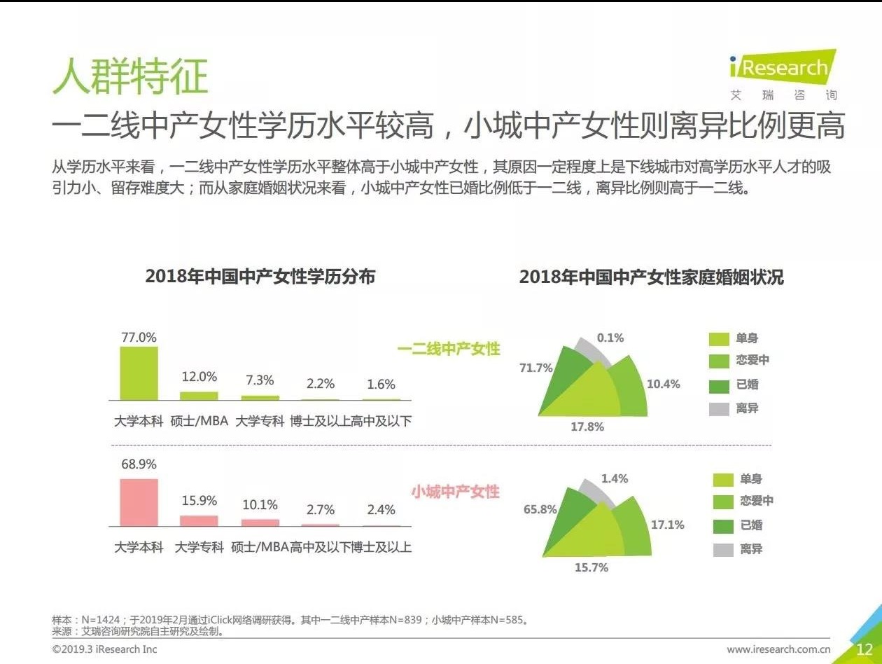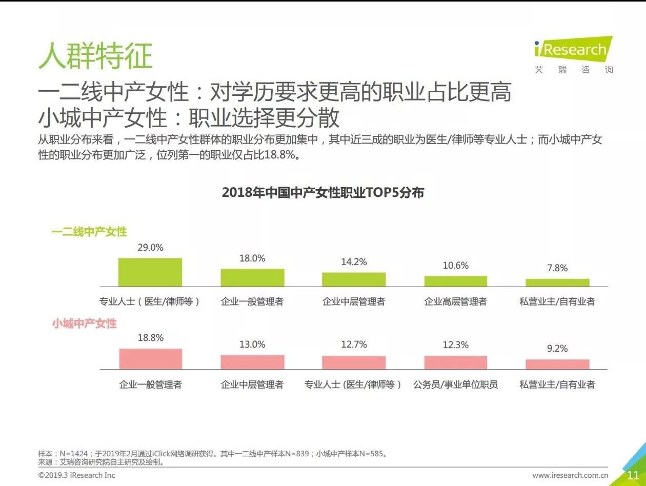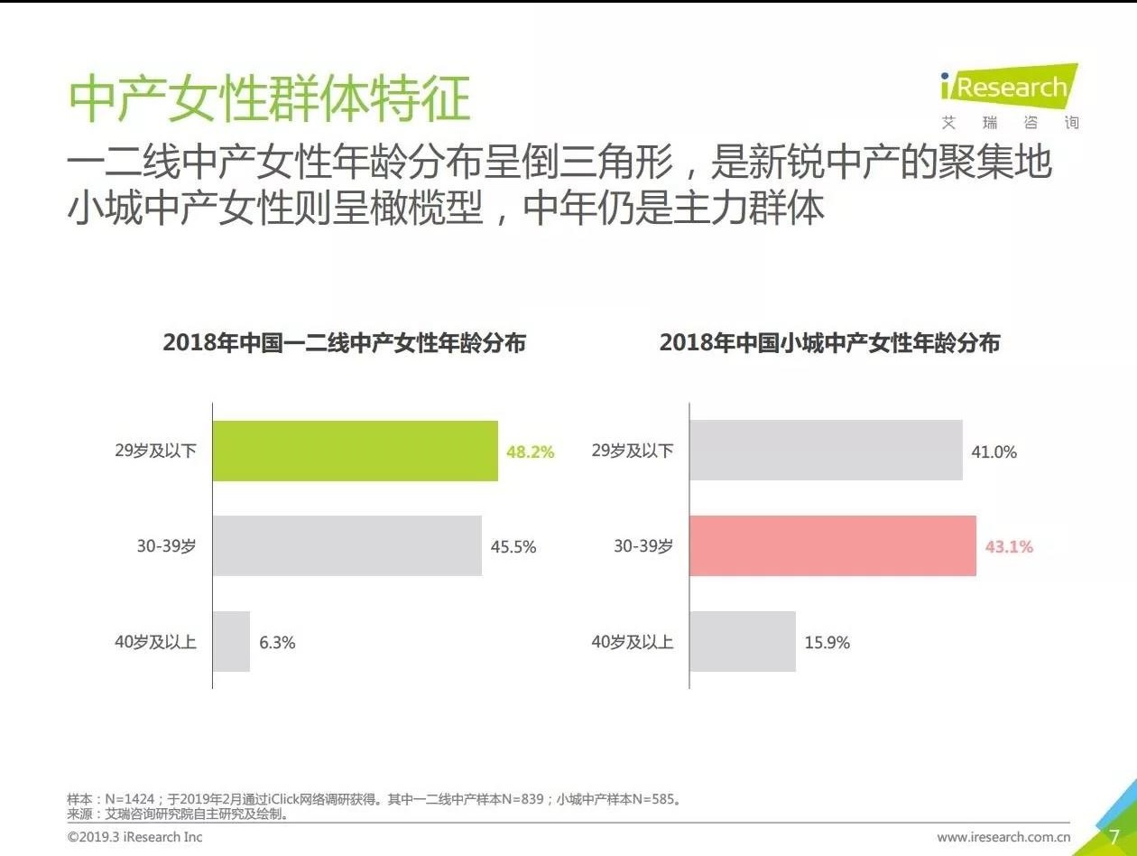 一二线城市中产女性有48.2%集中在29岁以下,年龄分布呈倒三角形,学历水平更高;小城中产女性以30-39岁为多,职业选择较为分散,年龄结构呈橄榄型。