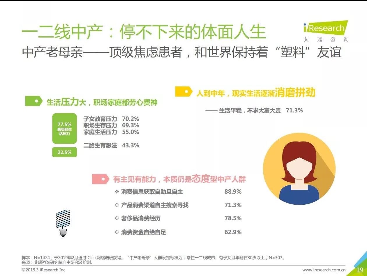 中产老母亲——顶级焦虑者,生活压力大,职场家庭都劳心费神。同时有主见、有能力,本质仍是态度性中产人群。