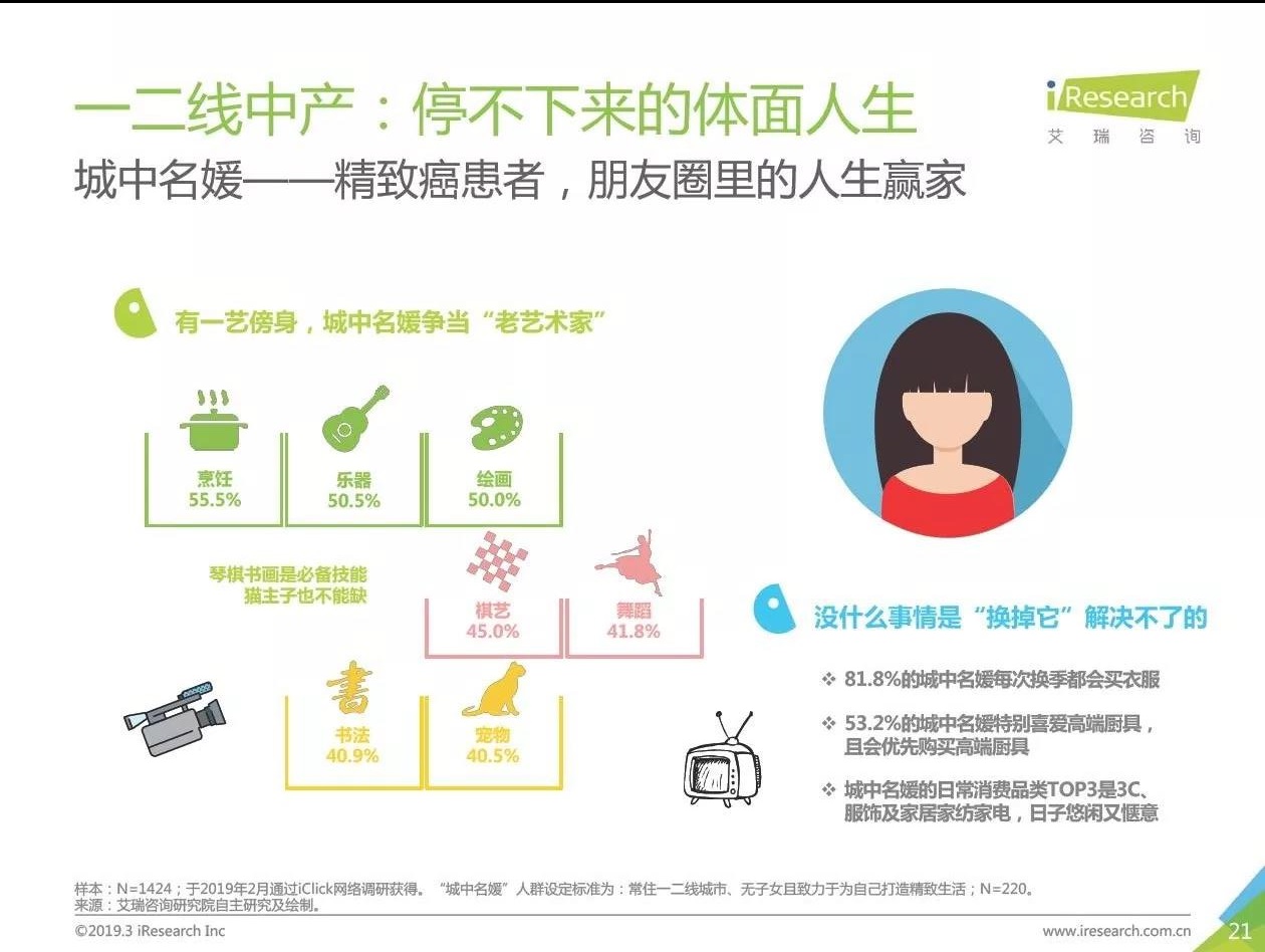 城中名媛——精致癌患者,朋友圈里的人生赢家。城中名媛的日常消费品类TOP3是3C、服饰及家居家纺家电。