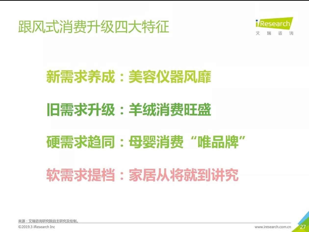 跟风式消费升级有四大特征:新需求养成——美容仪器风靡、旧需求升级——羊绒消费旺盛、硬需求趋同——母婴消费“唯品牌”、软需求提档——家居从将就到讲究