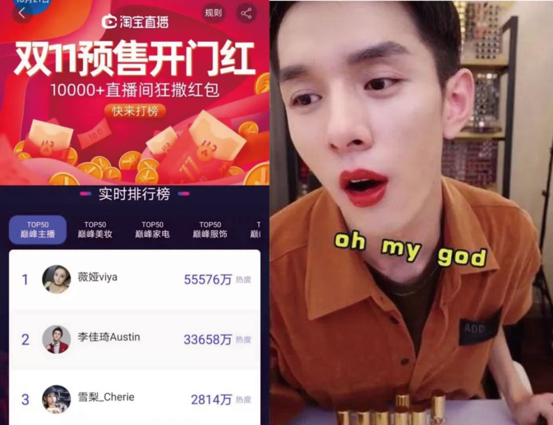 “双十一”预购第一天“口红一哥”李佳琦就提前掏光了“所有女生”的钱包,并且表示其存货已经不多,“淘宝直播一姐”薇娅也在当晚以5.5亿的直播热度登上淘宝直播的巅峰主播榜榜首。