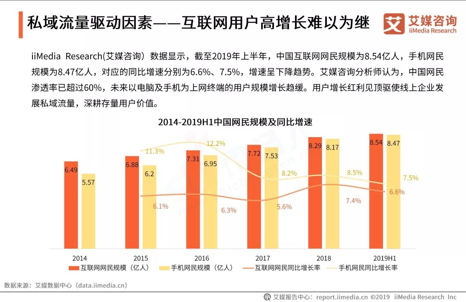 截至2019年上半年,中国互联网网民规模为8.54亿人,手机网民规模为8.47亿人,中国网民渗透率已超过60%,互联网进入存量用户运营时代。通过私域流量运营来降低营销成本逐渐成为主流趋势。