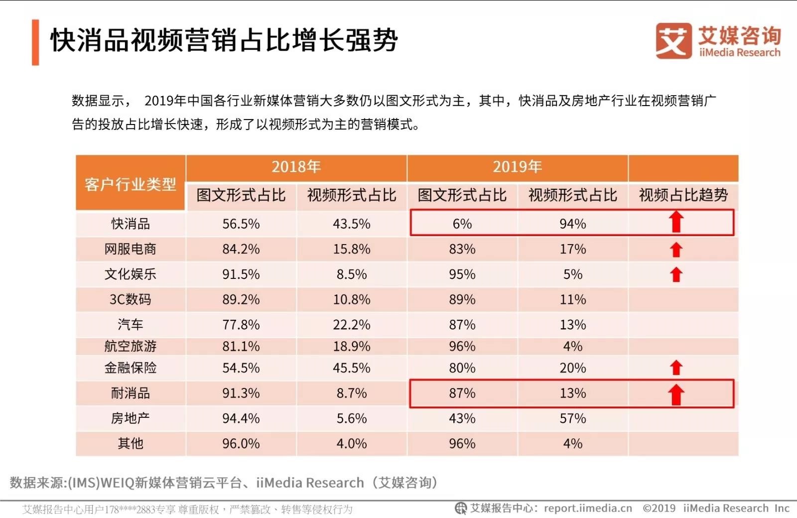 在新媒体营销广告形式投放占比分布方面,视频营销占比由2018年9.0%提升至16.0%。其中快消品行业视频营销投放比例从2018年的43.5%增长至94.0%,增长趋势迅猛。