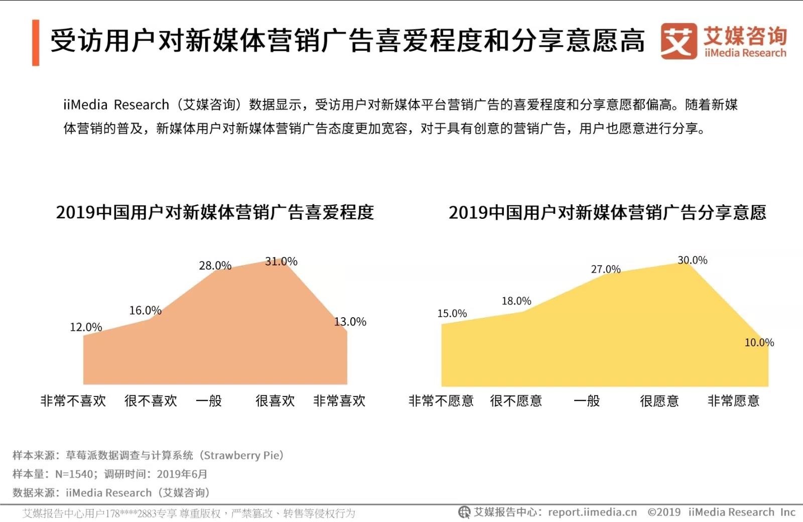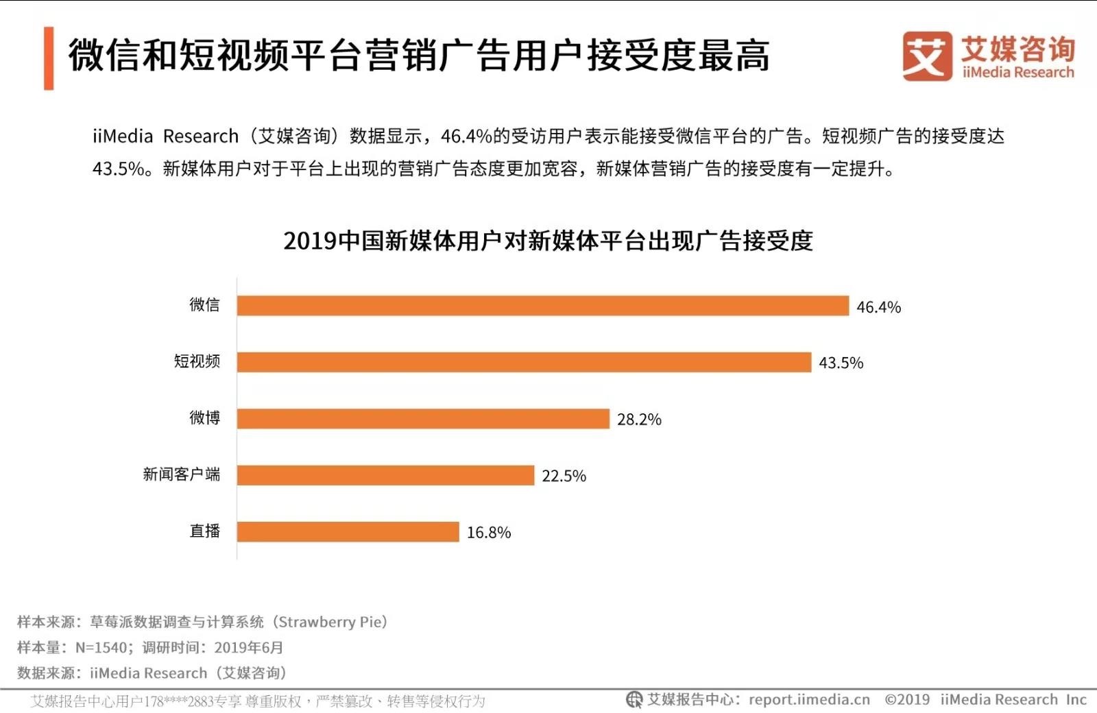 超过七成用户认可新媒体平台营销广告且分享意愿都偏高。新媒体用户对新媒体营销广告态度更加宽容,其中短视频广告的接受度达43.5%。