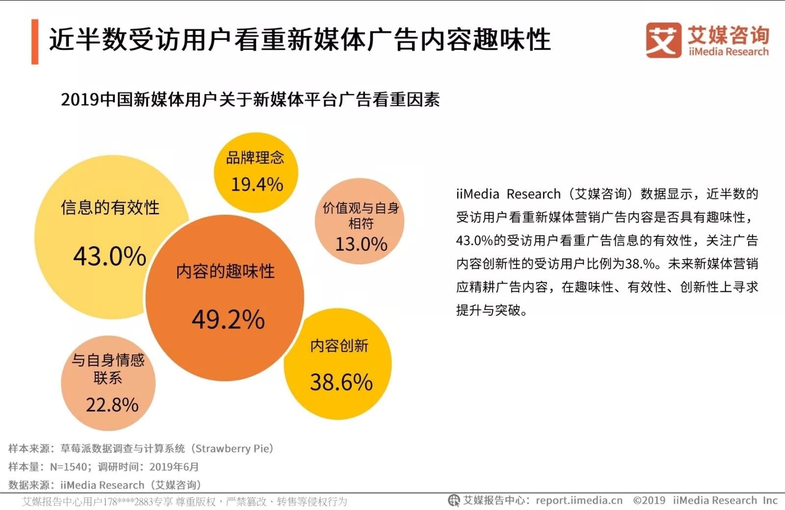 另外,近半数的受访用户看重新媒体营销广告内容是否具有趣味性,未来新媒体营销应精耕广告内容,在趣味性、有效性、创新性上寻求提升与突破。
