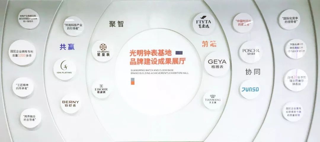 光明钟表基地品牌建设成果展示厅,向公众充分展示了深圳钟表集聚基地(以下简称“时间谷”)的品牌建设成果。展厅主要分为五大展区,分别为全国钟表产业知名品牌示范区创建过程、“五位一体”助力高质量发展、品牌企业、知识产权工作站以及钟表基地未来发展,展厅更配备了大型LED屏幕及演讲台,鼓励基地企业举办培训、路演、产业论坛等活动,营造良好的创业创新氛围。