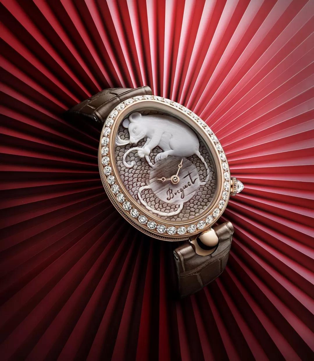 腕表搭载经宝玑自制机芯。表盘上饰有白棕色调贝壳浮雕,搭配玫瑰金表壳。生肖鼠栖息于金星之上,宛若从浮雕工艺雕刻的贝壳中跃然而出。精美的玫瑰金指针指示时分显示,玫瑰金表圈之上有着总重2.42克拉的明亮式切割钻石环绕镶饰。腕表配备棕色表带与贝壳色调相互映衬。