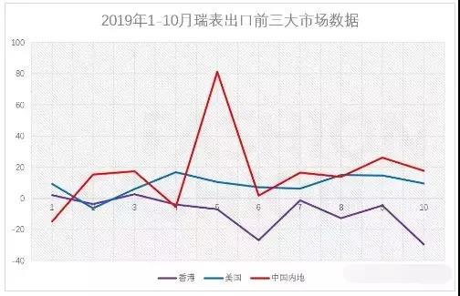 截止至十月份的数据统计,中国内地首次力压香港市场成为瑞表月度出口第二大市场,美国、中国内地、香港市场分列瑞表月度前三大出口市场的排序。