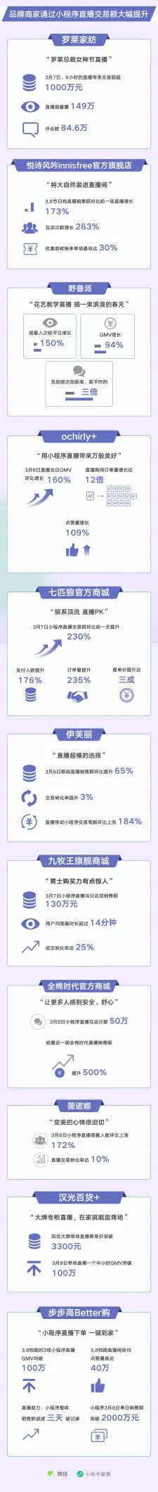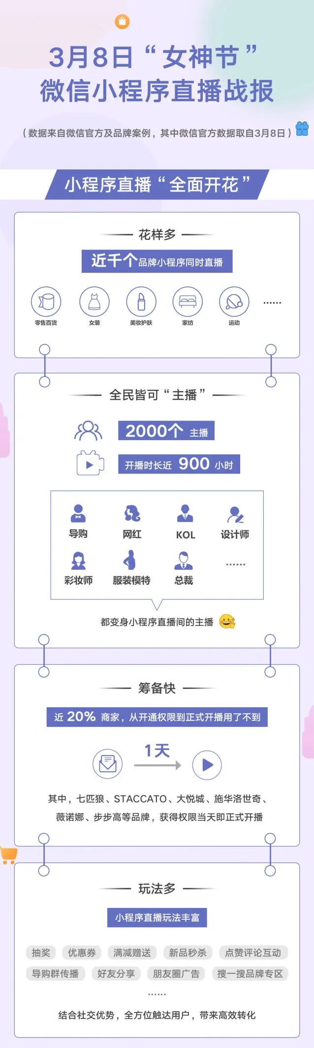 随着国内疫情逐渐得到控制,国内消费市场也逐渐回暖,2020年三八妇女节当天,近千个品牌同时使用小程序直播“卖货”。3月10日,微信官方发布了 “女神节”微信小程序直播战报,多角度、全方位展现了小程序直播在对于商家的作用与影响。