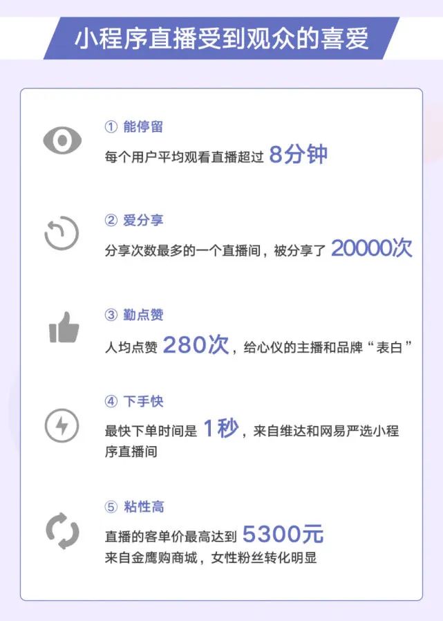 观众不仅热衷于分享、点赞,下手买单也是毫不犹豫。在维达和网易严选小程序直播间,最快下单时间仅为1秒。此外,在金鹰购商城的直播间,客单价最高达到了5300元,女性粉丝转化明显。