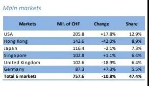 瑞士钟表出口在亚洲市场呈下跌趋势。其中香港下跌42%,是过去20年来最严重的月度跌幅。而美国、德国、法国及意大利市场则有所上升。(统计数字乃基于联邦海关管理局拟备的国外贸易统计)