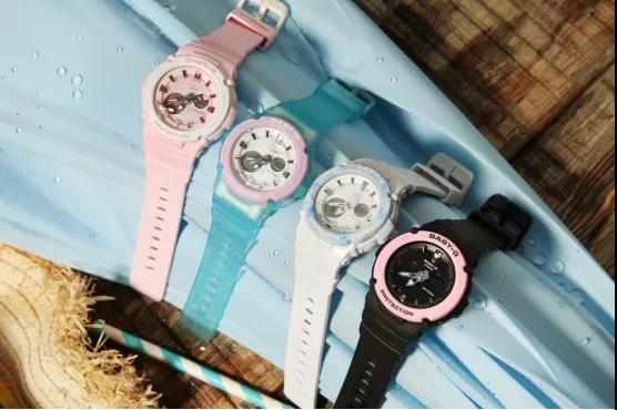 BABY-G BGA-270系列以夏日海滩为主题,双层表圈青春活力的配色,金属刻度点缀表盘,搭载指针液晶双显设计,让人对时间、星期一目了然,表圈边缘还采用了四个防护装置的全新设计,配备100米防水功能,将满满的夏日气息注入腕表之中,打造出海滩穿搭的必备单品。