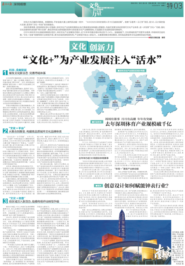 一个文化产业集群,更成为拉动区域发展、优化区域产业结构的动能。作为“十大特色文化街区”之一,大浪时尚小镇以时尚赋能,让龙华这个工业大区正朝着打造世界级时尚产业集群的目标迈进;去年9月,全国新媒体演艺与直播人才南方产学研总部基地签约,落户宝安区大视界国际影视文体产业园;而致力于打造“深圳东部文化高地”的龙岗区更是将文化产业作为区域经济的重要驱动力,2019年全区文化产业营业收入首次突破2000亿大关。