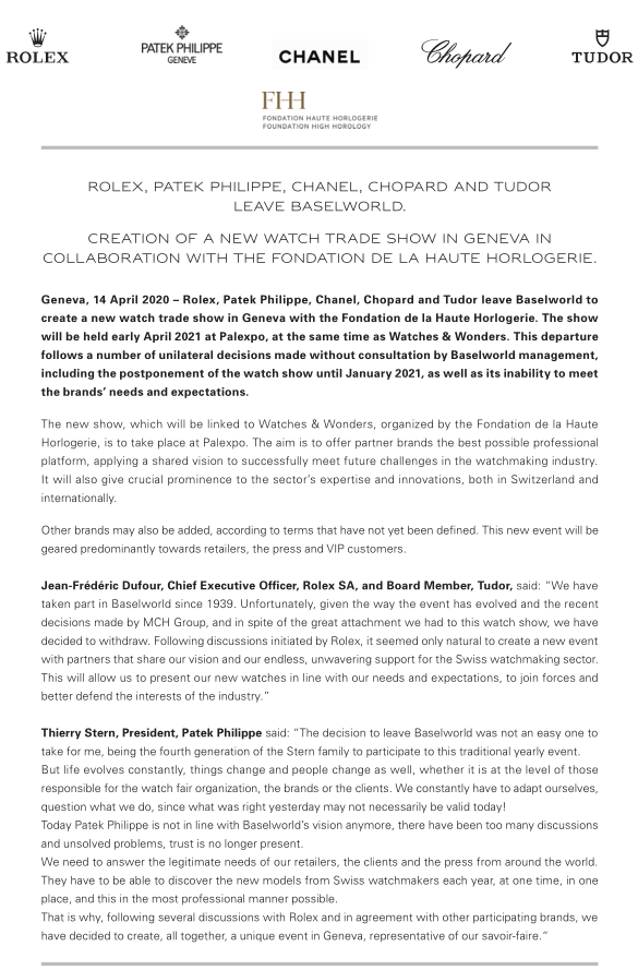 4月14日,劳力士、百达翡丽、香奈儿、Chopard萧邦和帝舵表宣布离开巴塞尔国际钟表珠宝展(Baselworld),并将与瑞士高级制表基金会(FHH)合作创办全新钟表贸易展览会。这场展览将于2021年4月初与钟表与奇迹高级钟表展同期举行。