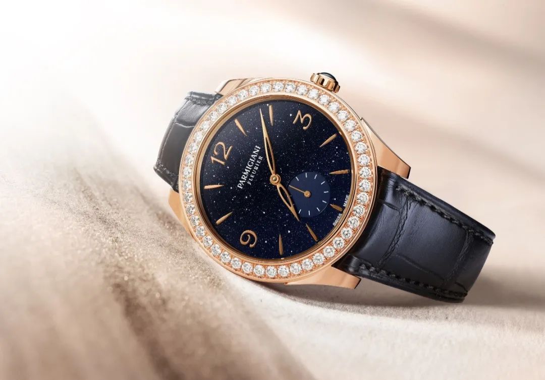 帕玛强尼倾心推出了华美优雅的全新通达系列。钻石、砂金石和珍珠贝母搭配蕾丝魅惑,为精致表款更添华彩。搭载金质摆陀的品牌自制PF310自动上链机芯,表圈镶嵌46颗IF级钻石,总重达1.8克拉。表冠饰以一颗凸圆形切割蓝色蓝宝石,搭配靛蓝色爱马仕鳄鱼皮表带为该款奢华腕表画上点睛之笔。直径为33毫米或是36毫米的表款均采用玫瑰金材质。