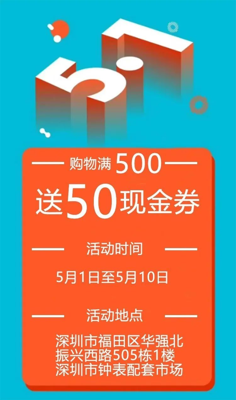 5月1日,全国最大的钟表产品聚散中心——深圳钟表配套市场举办了为期一月的满减大活动。活动期间凡在钟表配套市场,累积消费满500元以上(含500元)的前50名就可以凭当日小票领取50元现金券。