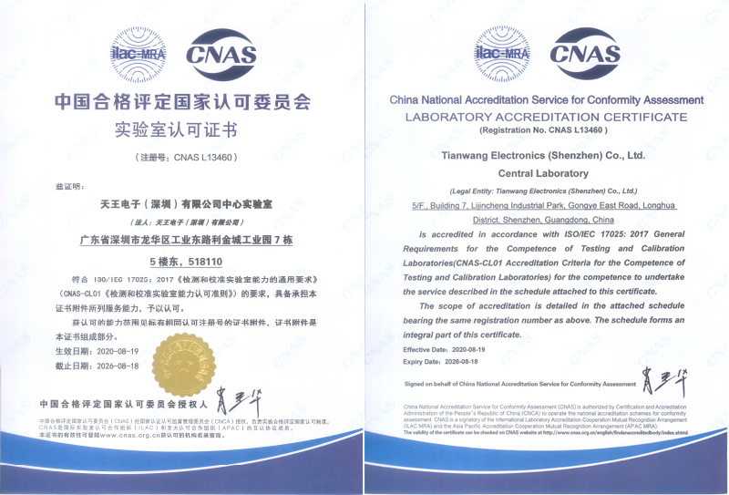 近日,天王电子(深圳)有限公司(以下简称天王)中心实验室获得CNAS证书(证书编号:CNAS L13460),正式成为国家认可实验室。