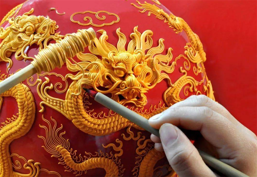 漆线雕以精细的漆线经特殊的制作方法缠绕出各种金碧辉煌的人物及动物形象,尤以民间传统题材为多,如龙凤、麒麟、云水、缠枝莲等。