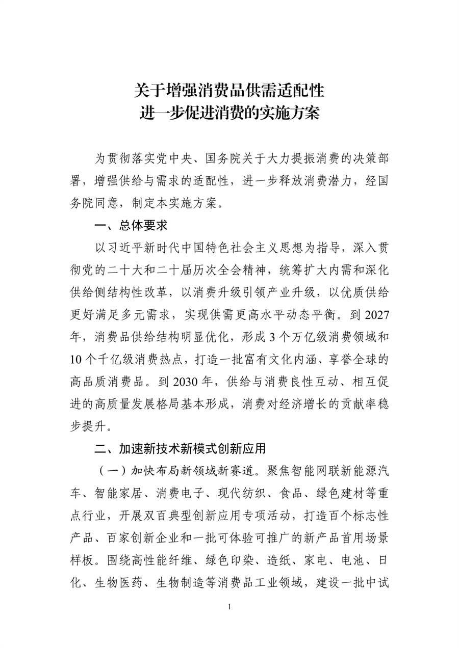日前,经国务院同意,工业和信息化部、国家发展改革委、商务部、文化和旅游部、中国人民银行和市场监管总局联合印发《关于增强消费品供需适配性进一步促进消费的实施方案》(以下简称《方案》),以消费升级引领产业升级,以优质供给更好满足多元需求,实现供需更高水平动态平衡。这是党的二十届四中全会召开后首个印发的关于促消费政策文件。