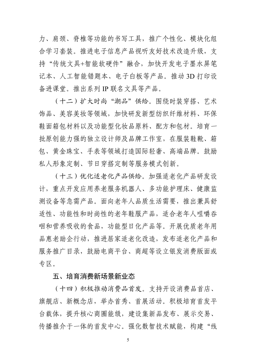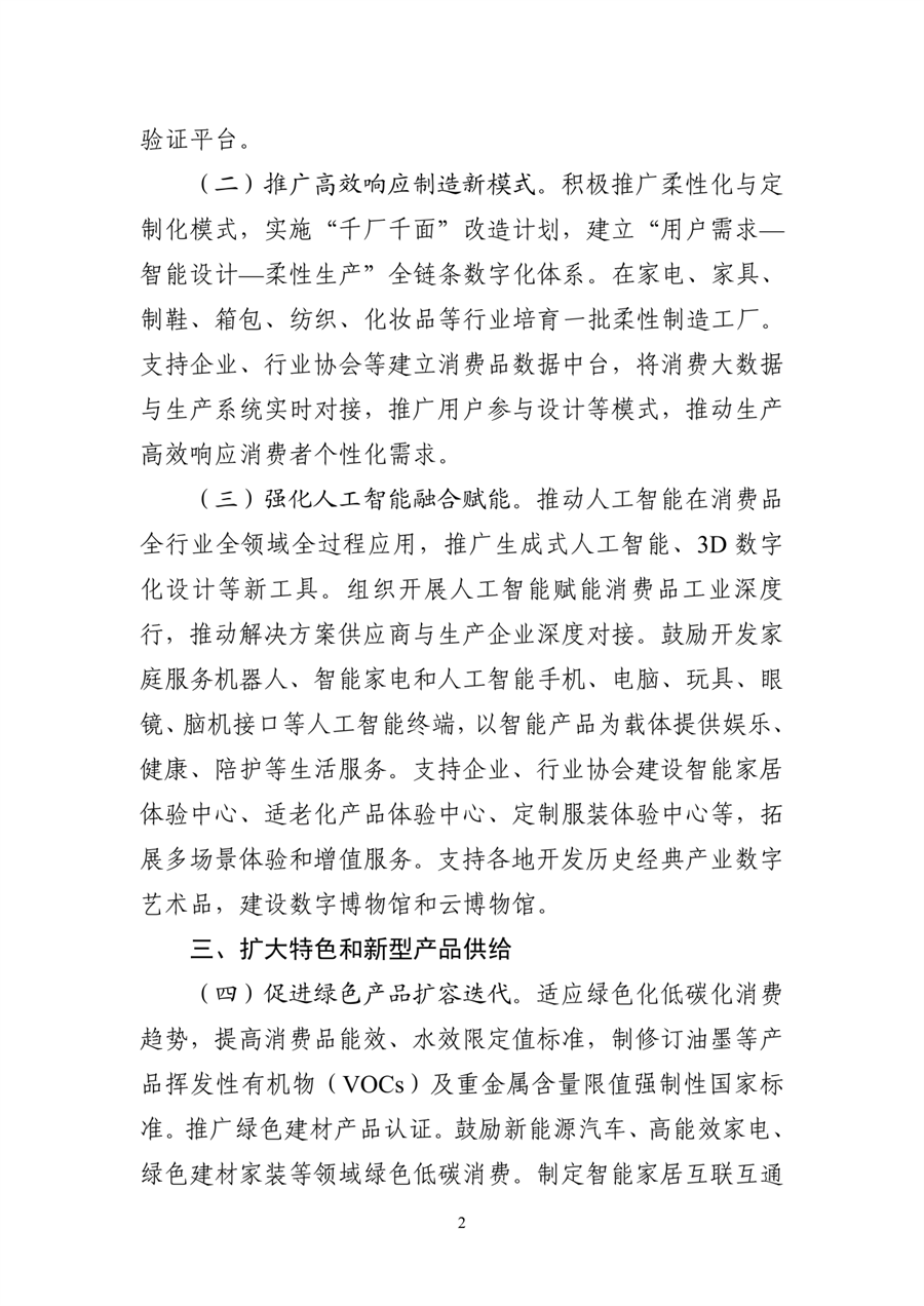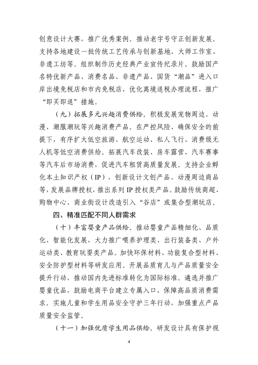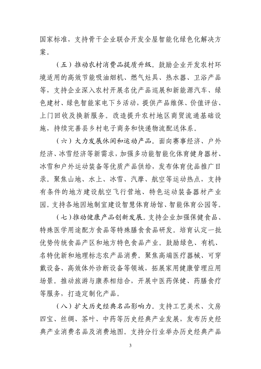 二是深挖存量,扩大特色和新型产品供给,包括促进绿色产品扩容迭代、推动农村消费品提质升级、大力发展休闲和运动产品、推动健康产品创新发展、扩大历史经典名品影响力、拓展多元兴趣消费供给等。