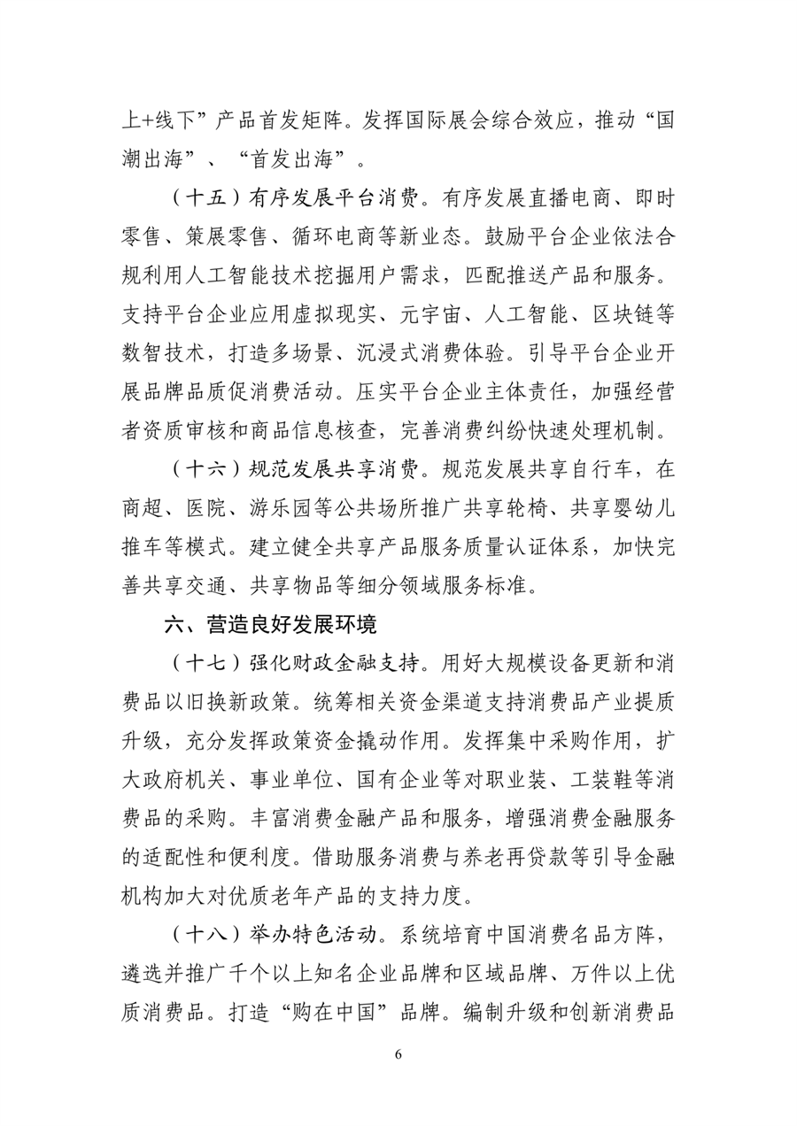 四是场景赋能,培育消费新场景新业态,包括积极推动消费品首发、有序发展平台消费、规范发展共享消费等。
