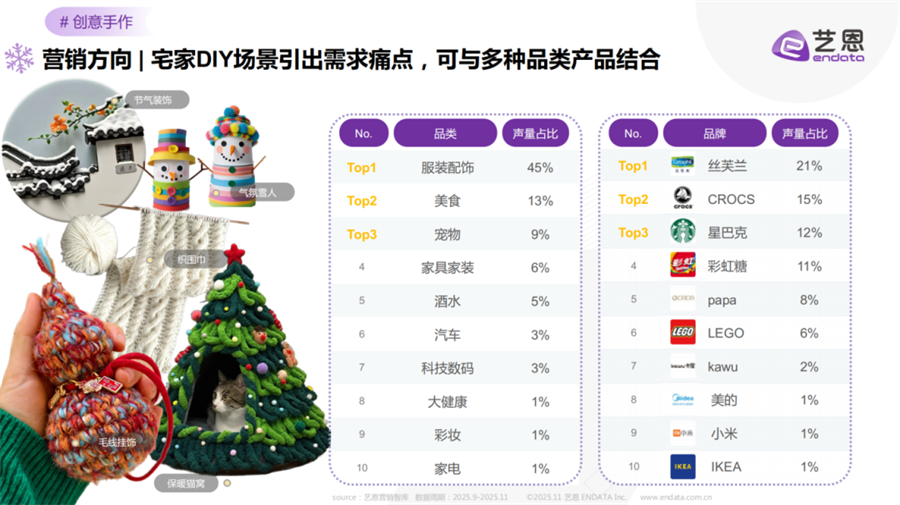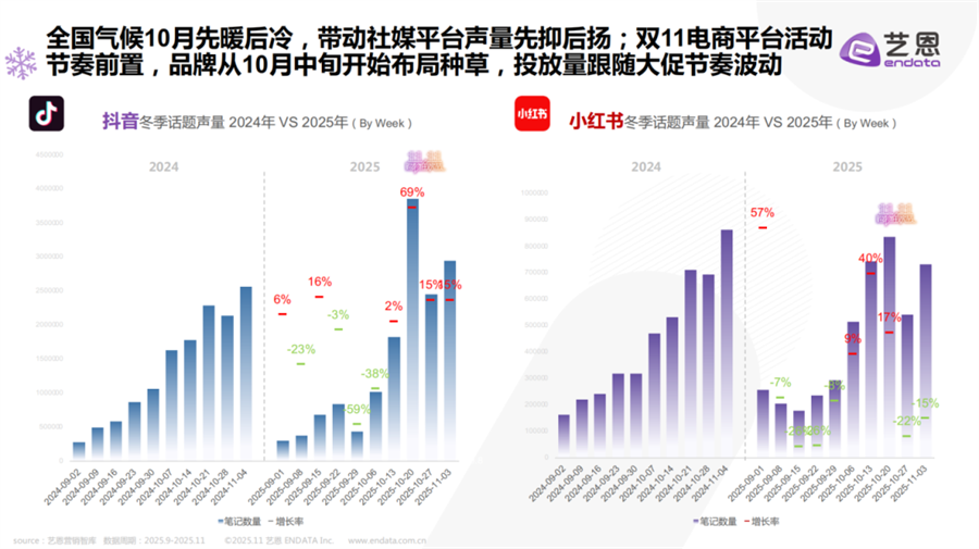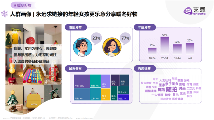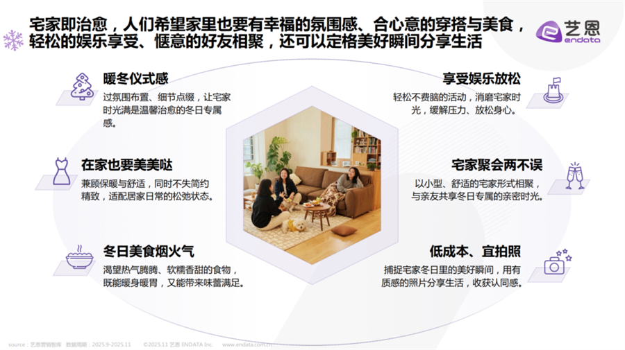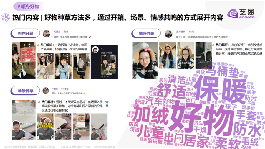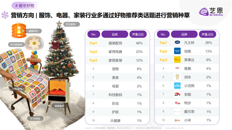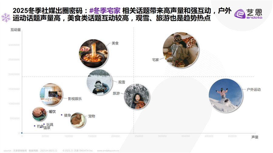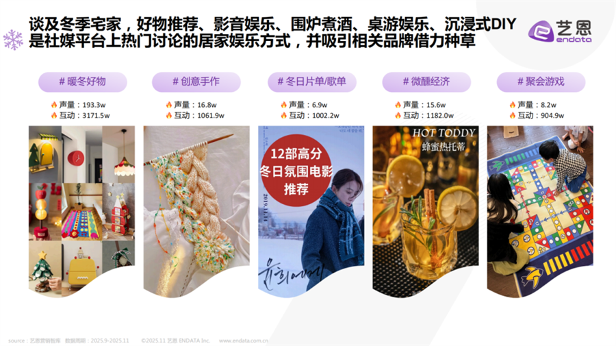 艺恩发布了《2025冬季室内娱乐社媒趋势与品牌机遇》报告,随着气候变冷,品牌10月开始布局种草,通过好物推荐类话题进行营销,冬日宅家场景品牌植入,精准击中用户暖冬痛点,打造沉浸式消费体验。