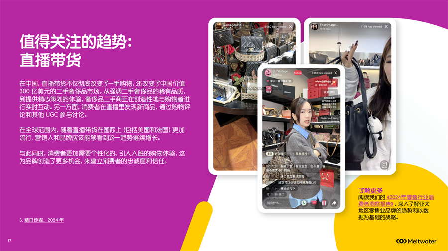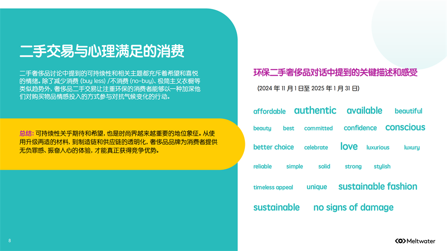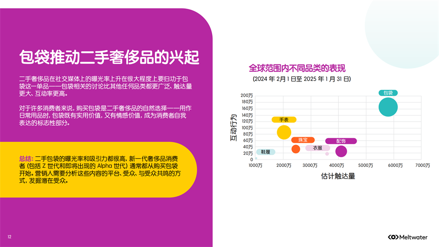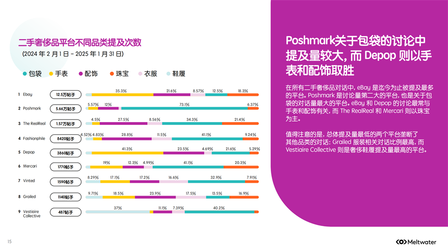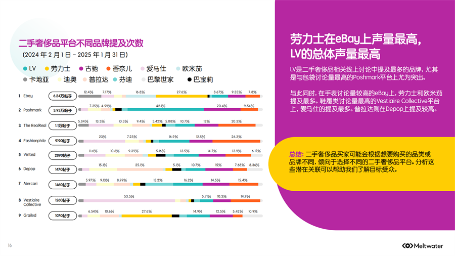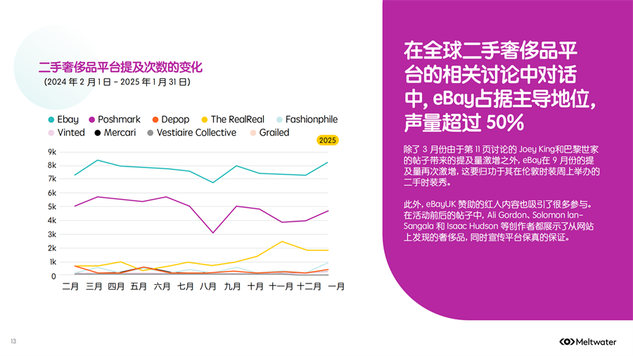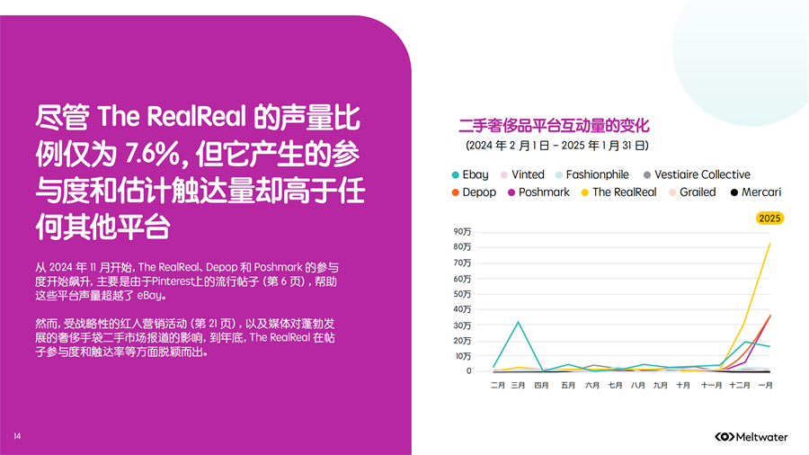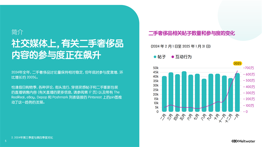 Meltwater 发布了《2025年二手时尚奢侈品市场消费者洞察》,2024年全年,二手奢侈品讨论量保持相对稳定,但年底时参与度激增,环比增长约 200%,线上二手奢侈品行业已出现领先品牌。